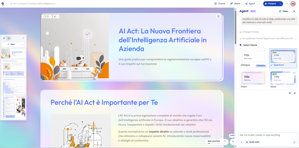 Immagina di avere la tua bozza di presentazione davanti e, a lato, una chat. Un vero e proprio “agente” AI a tua disposizione. Invece di cliccare su mille menu, gli scrivi cosa vuoi.