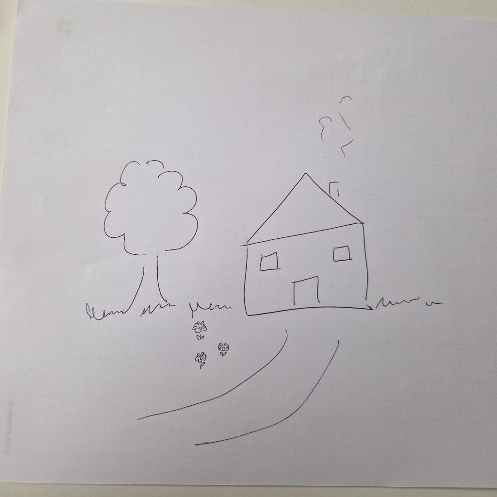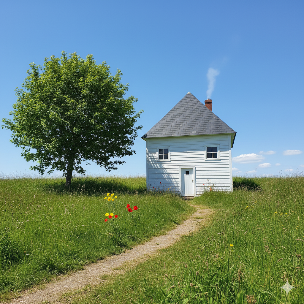 Trasforma questo schizzo in una foto ultra-realistica. Voglio una piccola casa bianca con un tetto di ardesia scuro, immersa in un campo d'erba alta in una giornata di sole. L'albero a sinistra deve essere grande e frondoso. Il sentiero deve essere sterrato e il fumo che esce dal camino leggero e soffice.