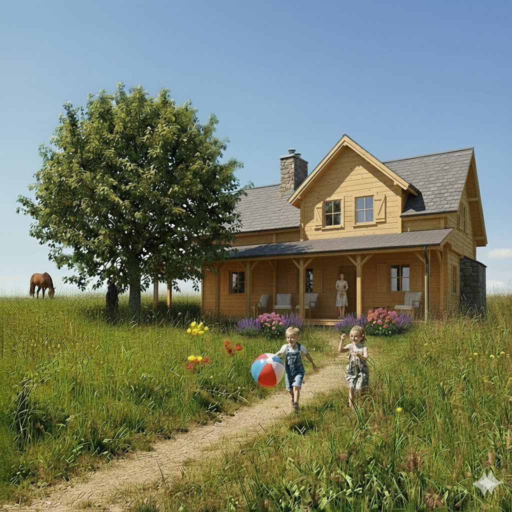 In questa immagine, trasforma la casa piccola e minimalista casa bianca con un tetto di ardesia scuro in una casa ampia in stile cottage e con un porticato e dei fiori davanti alla casa. In lontananza dietro all'albero aggiungi un cavallo. Mantieni la coerenza della scena