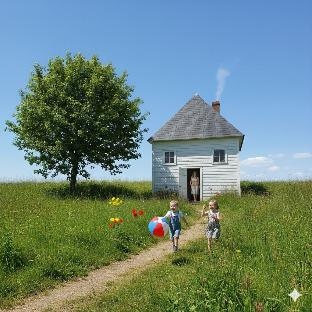 Aggiungi all'immagine della casa dei bambini che giocano e la mamma sulla porta che li osserva. La porta deve essere aperta