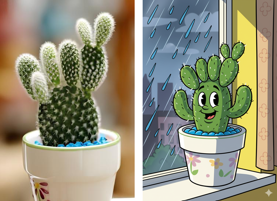 Reinterpreta la foto di questo cactus come un'illustrazione in stile fumetto hanna barbera. Il cactus deve sembrare un personaggio dei fumetti. È posizionato sul davanzale di una finestra in un appartamento, e fuori piove. Lo stile deve essere dinamico, con ombre nette e colori saturi. mantieni coerenza con la foto.